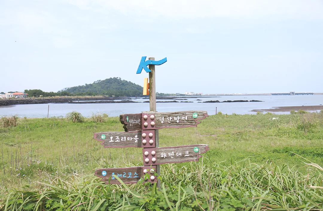 제주 올레길 2코스 온평올레길은 성산리 광치기 해변을 시작으로 식산봉, 고성, 대수산봉, 혼인지를 지나 온평포까지 약 15,8km의 올레길 코스 평균 거리를 걷게 됩니다. 광치기 해변에서 성산일출봉을 정면으로 바라보며 한숨을 크게 쉬고 2코스는 시작이 됩니다.둑방길을 따라 걷다보면 오조리마을에 도착하게 됩니다. 오조리마을에 도착을 하면 "오조리감상소"라는 곳을 보게 되는데, 이곳은 공항가는 길이라는 드라마 촬영지라고 합니다. 오조리마을은 민물과 바닷물이 모여 큰 호수 같은 곳을 지나면 정면으로 아름다운 성산일출봉을 먼 자취에서 조망이 됩니다. 그 후로는 오조양어장을 지나 식산봉 입구에 도착을 하게 됩니다. 식산봉을 내려오면 족지물을 지나게 계속해서 걷다 보면 큰 도로가 있는 마을길을 지나면 수산 봉수대..