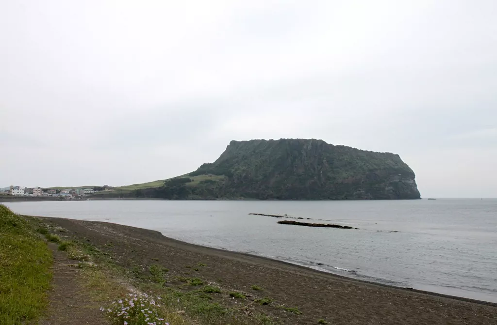 광치기해변: 1코스의 피날레입니다. 썰물 때 드러나는 초록빛 이끼 낀 바위와 성산일출봉을 배경으로 완주 인증샷을 남겨보세요. 15.1km의 피로가 싹 가시는 최고의 보상입니다.