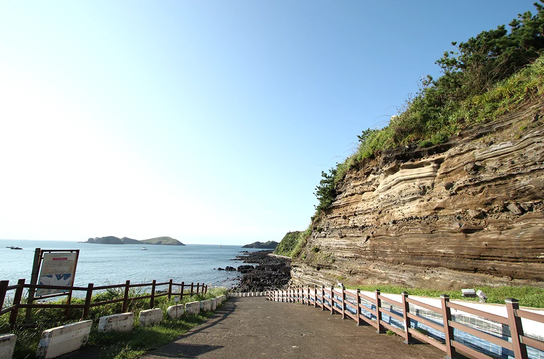 수월봉의 해안절벽은 응회암층으로 이뤄진 아주 독특한 지층 단면을 지니고 있어 지질학적으로 매우 중요한 곳입니다. 올레길을 걷는 분들께서는 이곳 정상만을 보고 이동하지 마시고, 고산포구까지 왕복 약 1,5km로 연결된 지질 트레일 코스를 따라 걸어보시는 것을 추천드립니다.