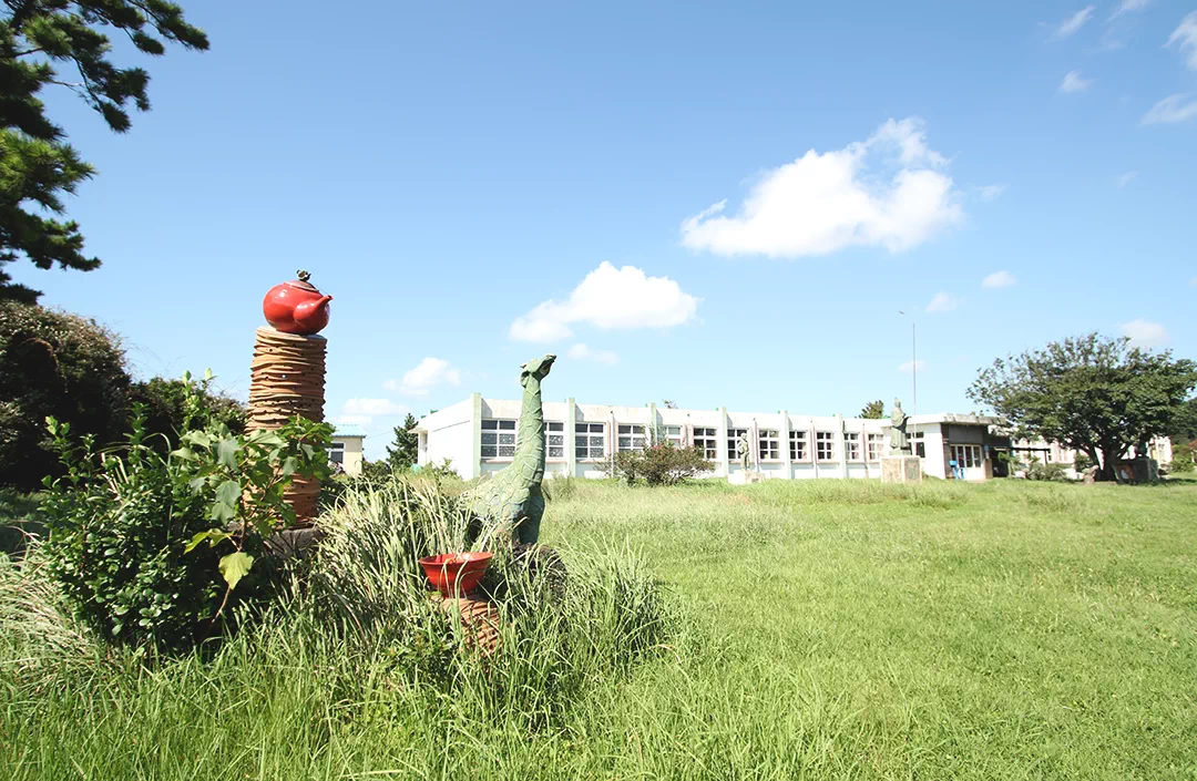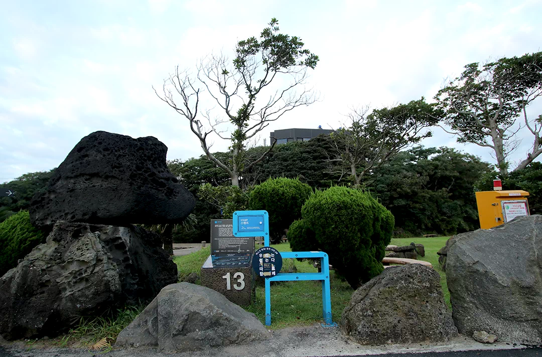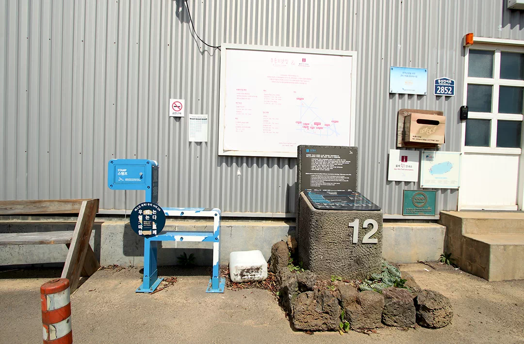 산경도예 정문에는 이 코스의 중반 스탬프를 찍을 수 있는 간세가 올레꾼들을 기다리고 있습니다. 내륙을 걸으며 흘렸던 땀을 나무 그늘 앉아 잠시 쉬어갈 수 있는 공간을 제공해 줍니다.